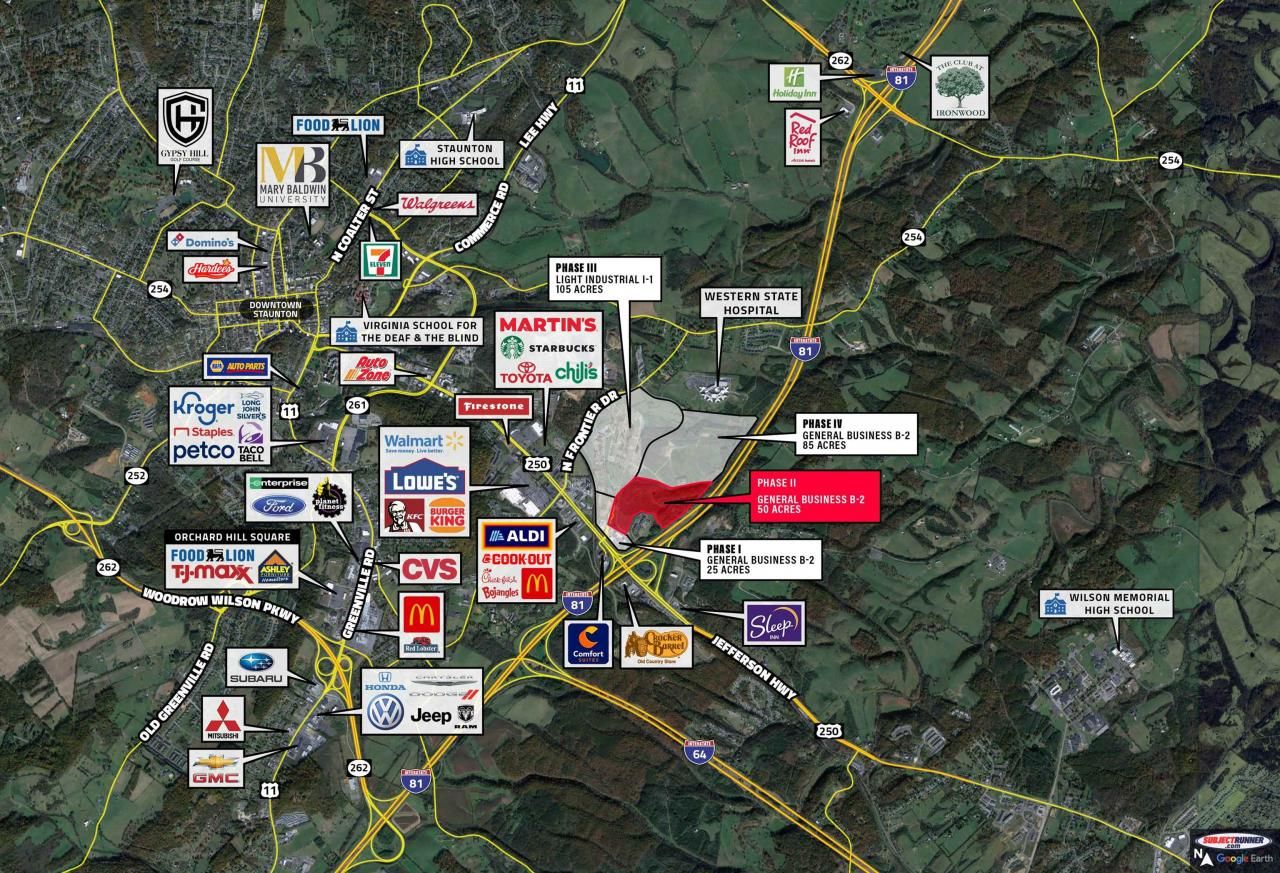 Staunton Crossing, 50 acres of prime B-2 divisible land ideal for retail development, is in a great location in rapidly growing Staunton, VA. This property is an ideal setting for retail and land investment opportunities and offers excellent transportation characteristics that make it accessible to businesses and customers alike. One of the key transportation features of Staunton Crossing is its almost 1-mile frontage on Interstate 81 at Exit 222 and its location at the intersection of I-81 and I-64. This central location provides easy access to major highways, making it an accessible location for businesses to transport goods and services in the heart of the Shenandoah Valley.