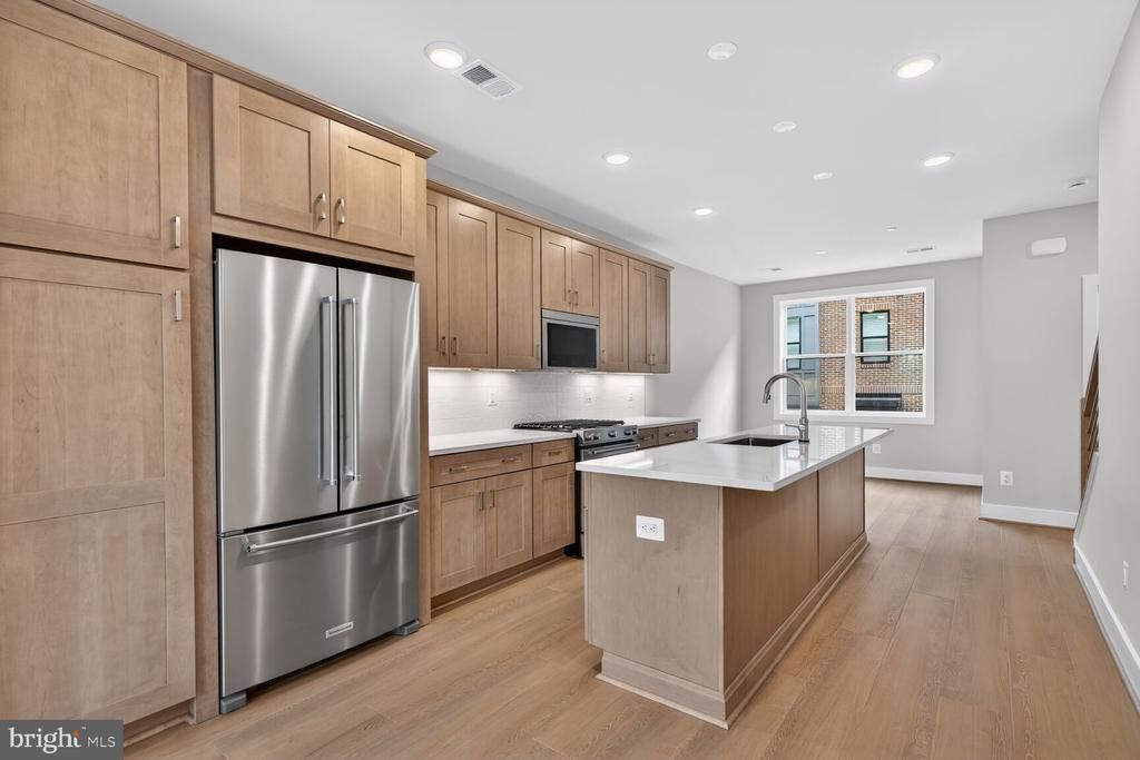 The open and airy main living level features a light-filled great room, a spacious dining room, and a stylish center kitchen. The chef’s dream kitchen is complete with Calacatta Gold quartz countertops, Artisan Maple Fog cabinets, Brushed Satin Nickel hardware, and KitchenAid stainless steel appliances. Upstairs boasts a stunning primary suite with two walk-in closets and a primary bath with stone countertops. The second level also has a spacious secondary bedroom with a private full bath. The third level offers an additional bedroom, full bath, a loft that is the perfect flex space, and a rooftop terrace.