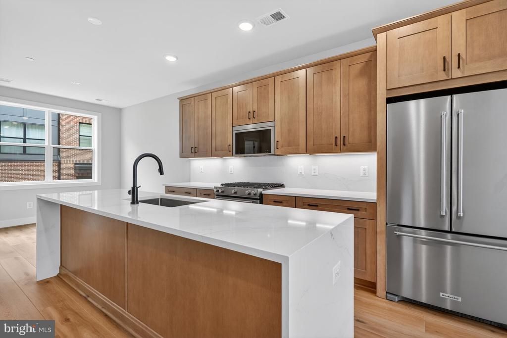 The open and airy main living level features a light-filled great room, a spacious dining room, and a stylish center kitchen. The chef’s dream kitchen is complete with Calacatta Gold quartz countertops, waterfall island, Artisan Maple Gunny cabinets, matte black hardware, and KitchenAid stainless steel appliances. Upstairs boasts a stunning primary suite with two walk-in closets and a primary bath with quartz countertops. The second level also has a spacious secondary bedroom with a private full bath. The third level offers an additional bedroom, full bath, a loft that is the perfect flex space, and a rooftop terrace.